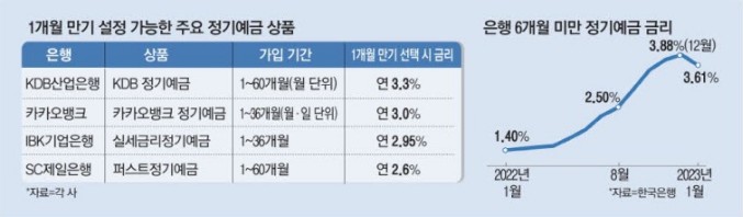 기존에는 은행들이 만기를 1개월로 정할 수 있는 정기예금 상품을 판매하는 경우가 많았지만 1개월 예금금리가 제2금융권 파킹계좌보다 높은 것은 이례적이라고 합니다. 앞서 카카오뱅크, 케이뱅크, 신한은행은 1개월 정기예금에 연 3%의 금리를 책정했고, IBK기업은행은 개인 고객도 가입할 수 있는 정기예금의 최소 만기가 있는 1개월 만기를 선택하면 연 2.95%의 금리를 제공한다고 합니다. 6개월 미만 정기예금 금리와 1년 만기 정기예금 금리의 차이도 줄었습니다. 한국은행 집계에 따르면 지난 1월 기준 6개월 미만 정기예금 금리는 연 3.61%로 1년 만기 금리인 4.1%와 0.49% 포인트 차이가 난다고 합니다. 지난해 10월까지만 해도 6개월 미만 정기예금의 금리는 1년 만기 정기예금보다 1% 포인트 이상 낮았습니다.