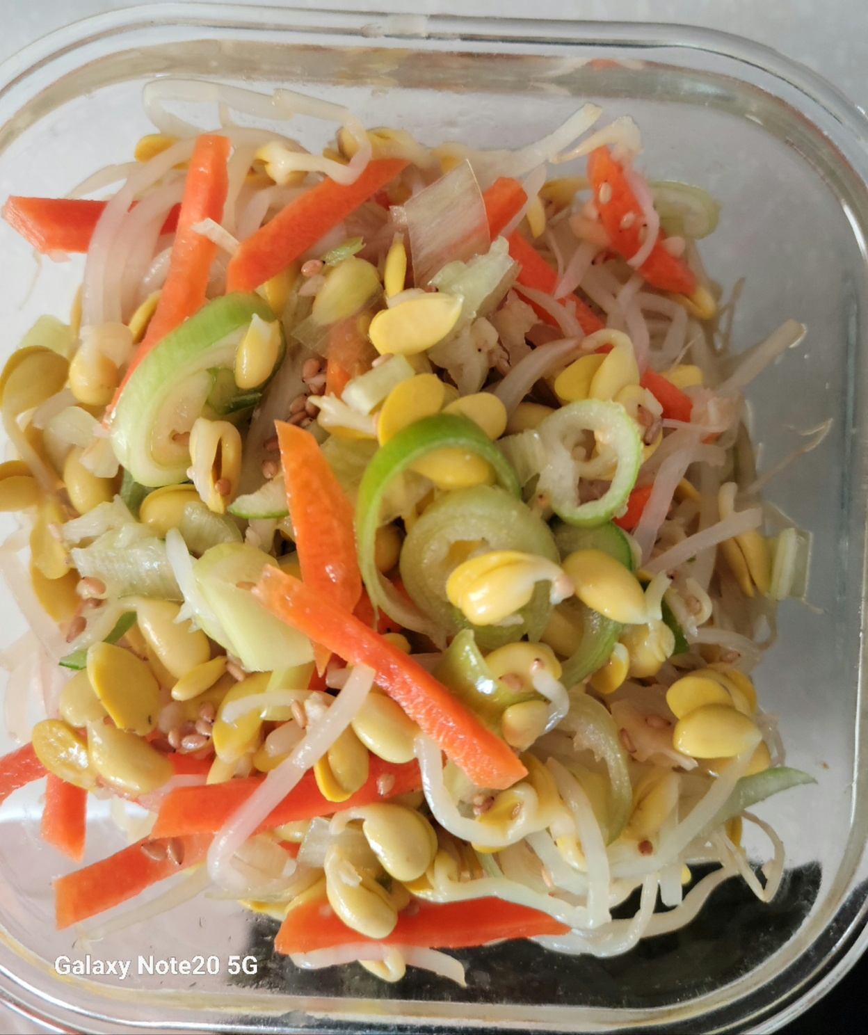 잘 데친 콩나물을 찬물에 잘 씻은 후 당근과 파, 참기름, 소금 간한 후 잘 무쳐주면 콩나물무침 완성이에요.