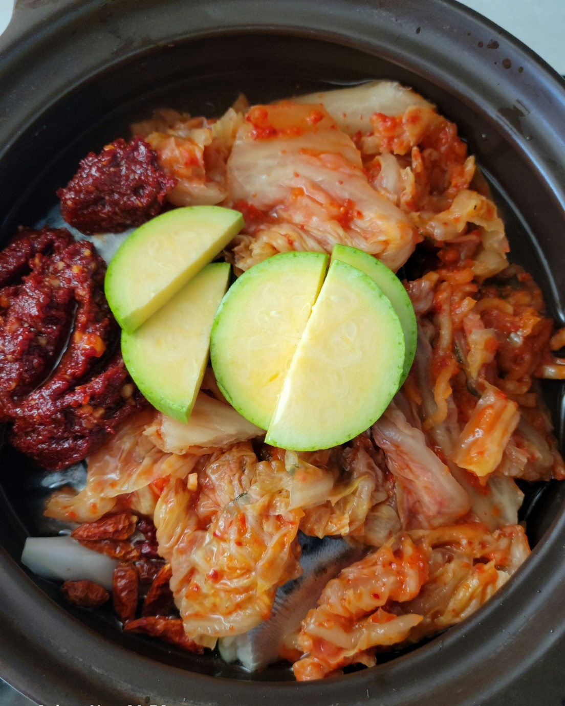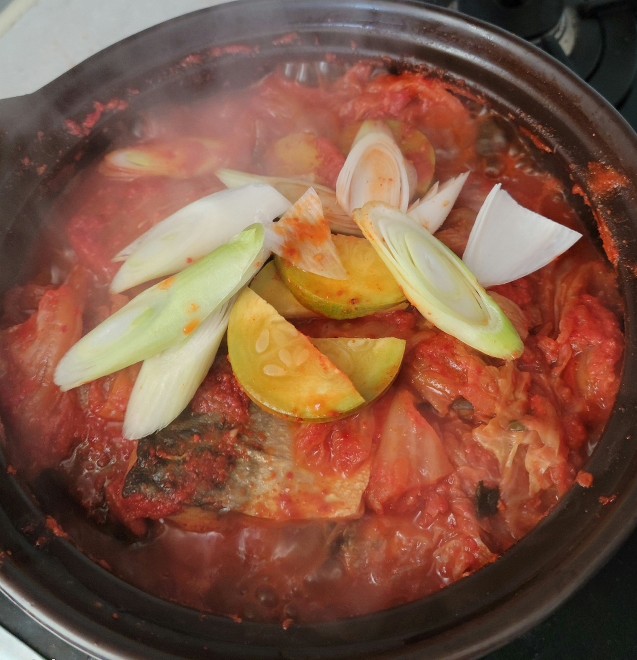 무를 제일 아래 깔고 고등어 올리고 김치, 양파, 고추, 호박, 양념장 먼저 넣고 넘치지 않도록 적당량의 물을 넣어 끓여줍니다.