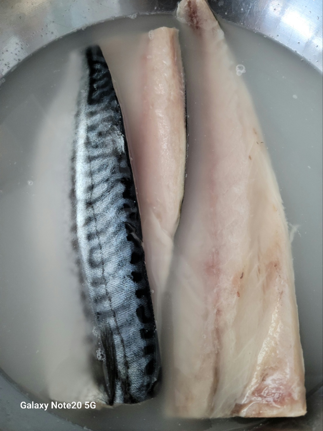 냉동실에 있던 손질 고등어를 쌀뜨물에 담가놓습니다. 비린내 없애는데 좋아요.