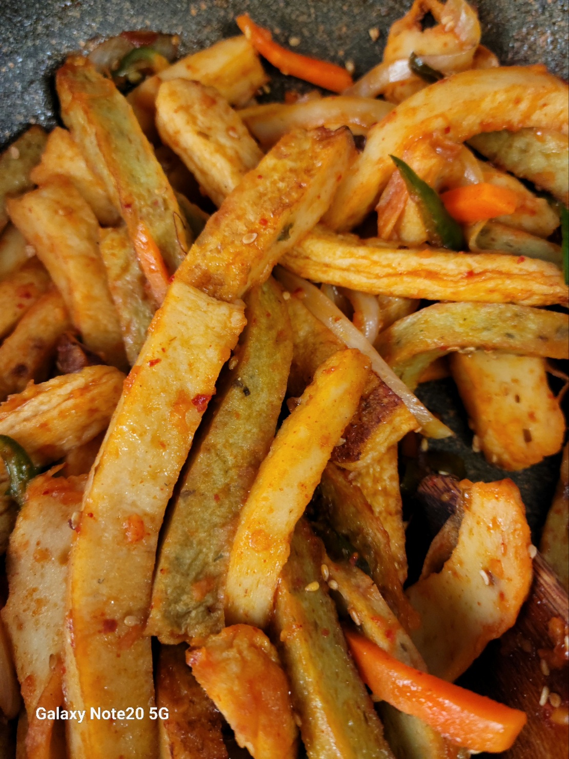 웍에 어묵과 야채들을 넣어 볶다가 어느 정도 익으면 분량의 양념을 넣고, 참기름과 깨소금으로 마무리합니다. 매운 어묵김밥재료로도 훌륭한 반찬이에요.
