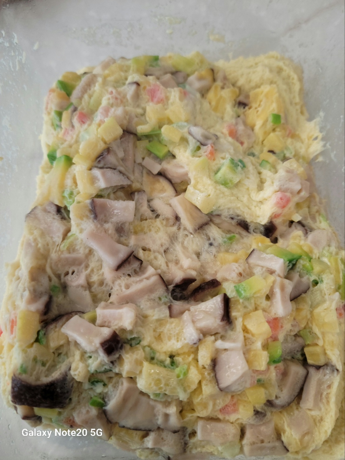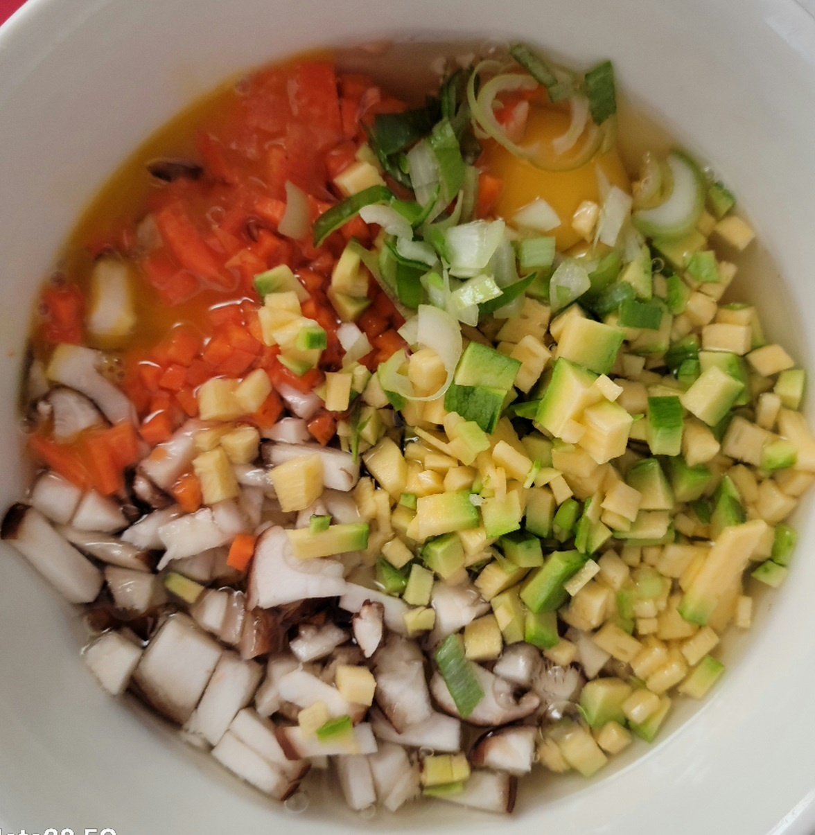 잘 다진 야채와 새우 젓간, 육수를 부어 달걀과 잘 섞어줍니다.
