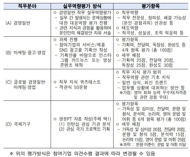 ○ 평가항목 : 참여동기 및 의지(20), 관심사 및 구직활동(10), 직무수행능력 및 직무적합성(30), 유사경험 및 자격(15), 성장잠재력(25)
