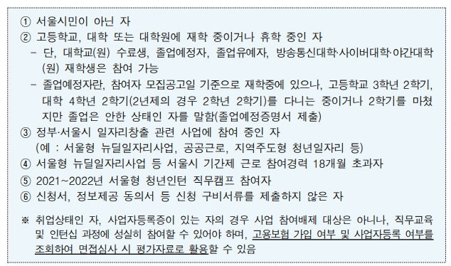 - 신청자격(발행개시일 기준) : 만 18세 이상 34세 이하의 서울시민(1988. 4. 25. ~ 2005. 4. 24.) 사업참가제외사유가 없는 자, 아래 표에 나온 대상은 사업참여배제대상입니다.