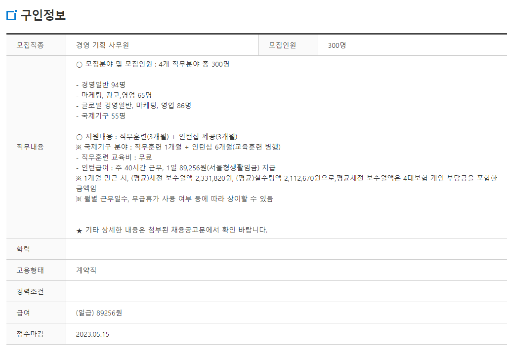 - 인턴급여 : 주 40시간, 1일 89,256원(서울형 생활임금)