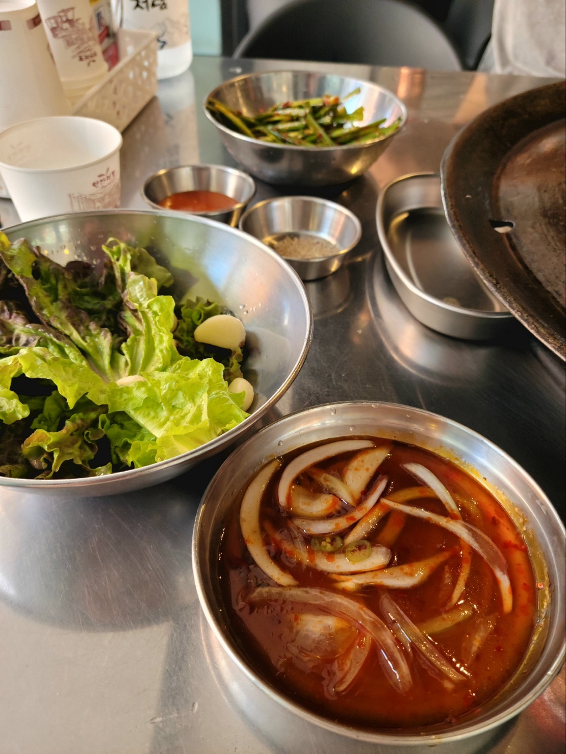 기본찬이에요. 부추나 상추, 마늘은 보통의 맛과 다르지 않았지만 양말절임물은 간장베이스가 아닌 멜젓느낌의 색다른 맛이었습니다. 고기와도 궁합이 잘 맞았고요.
