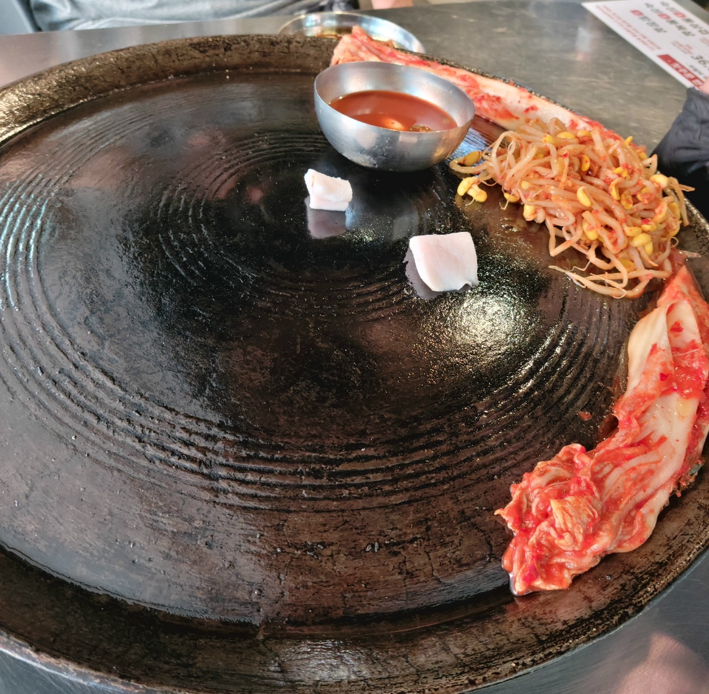 미리 세팅된 것은 김치와 콩나물, 가마솥에 돼지기름 바르라고 2조각 올라가 있습니다.