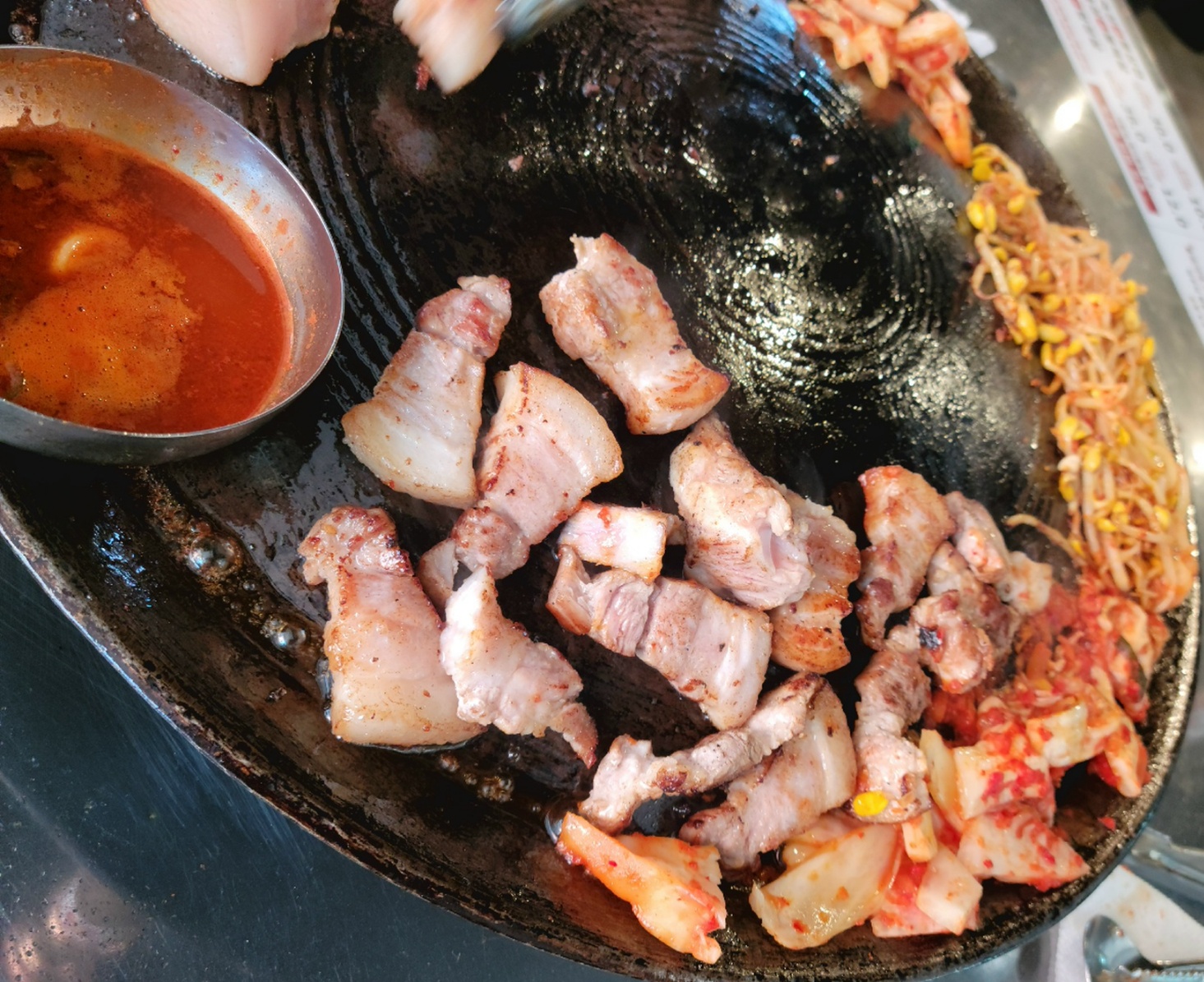 통으로 굽다 어느 정도 익으면 잘라먹는 삼겹구이는 생각보다 맛이 있었습니다. 멜젓도 따로 주셔서 끓인 소스에 찍어 먹으면 더욱 풍미가 살아납니다.