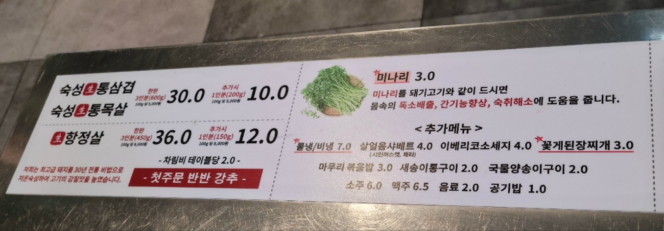 숙성 생 통삼겹이나 통 목살 모두 3인분 600g에 30,000원이고 추가 시 200g당 10,000원이네요. 항정살은 약간 비싼 가격을 형성하고 있고 상차림비가 따로 있습니다. 테이블당 2,000 원인점 알고 가시면 좋을 것 같아요. 미나리 3,000원을 비롯해 추가메뉴들이 있지만 고기를 다 드신 후 결정하셔도 될 것 같은 양이었어요.
