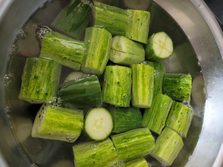 여기에 끊여놓은 소금물 투하 후 30분 정도 절여줍니다. 이렇게 하면 아삭한 맛을 오래 유지하며 오이소박이를 즐길 수 있답니다.
