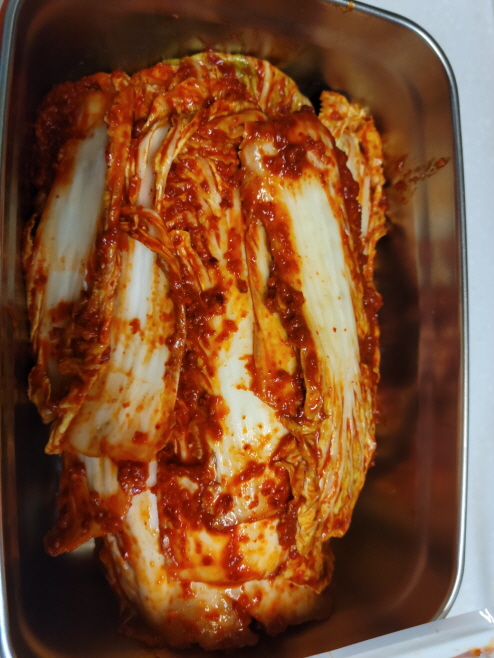 이렇게 다른 용기에 양념을 걷어내고 김치만 옮겨 담습니다.
