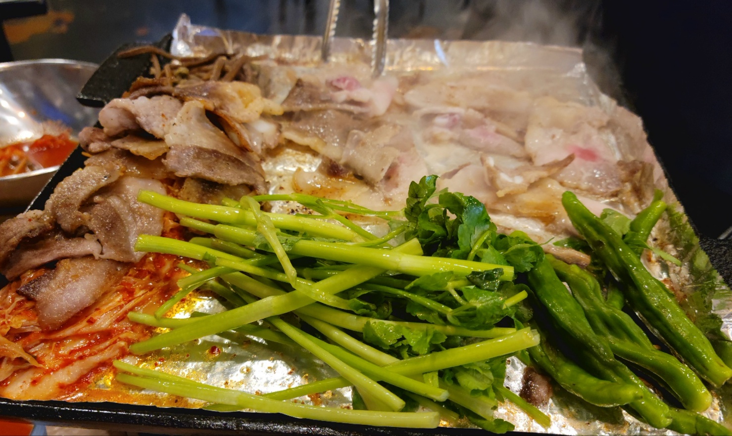 추가로 시킨 미나리와 꽈리고추, 야채와 함께 익어가는 삼겹살은 향부터가 달랐습니다. 맛있게 먹으면 영 칼로리가 맞겠죠?