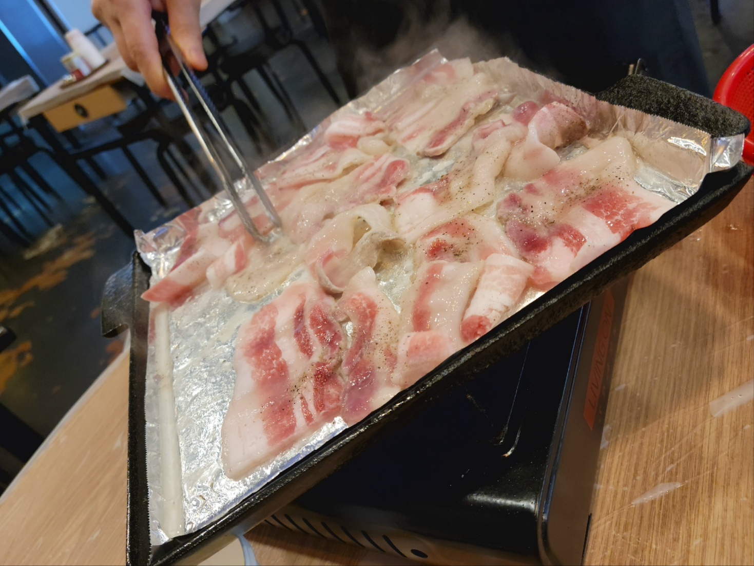 빨간 플라스틱 바구니에 냉삼이 담겨 나와 불판 위에 올려진답니다. 바구니가 좀 인상적이긴 했어요.
