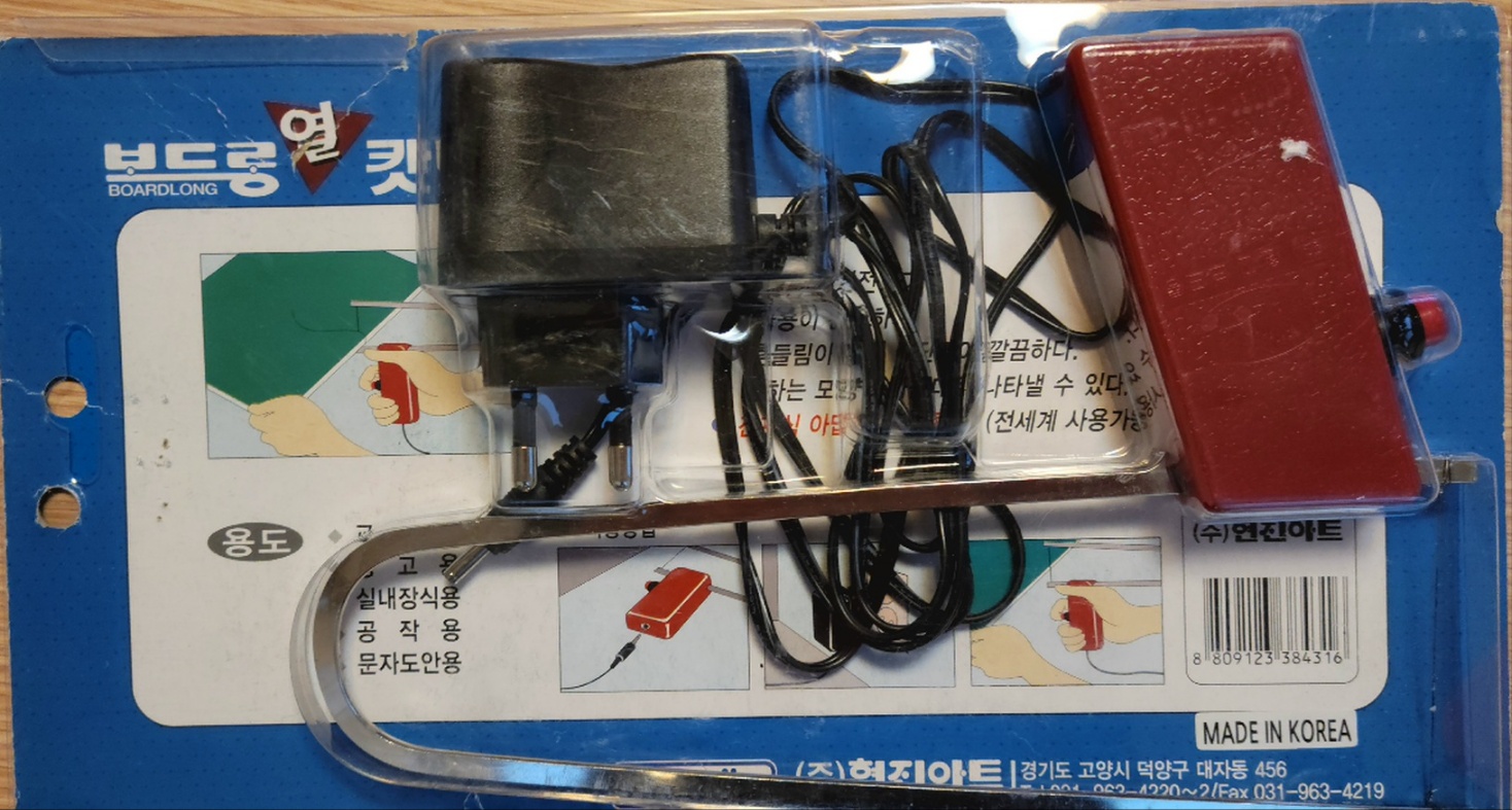 커터기는 유선과 무선이 있는데 위 제품은 유선용으로 연결 후에 빨간 버튼을 누르며 우드락을 오려내는 방법입니다.