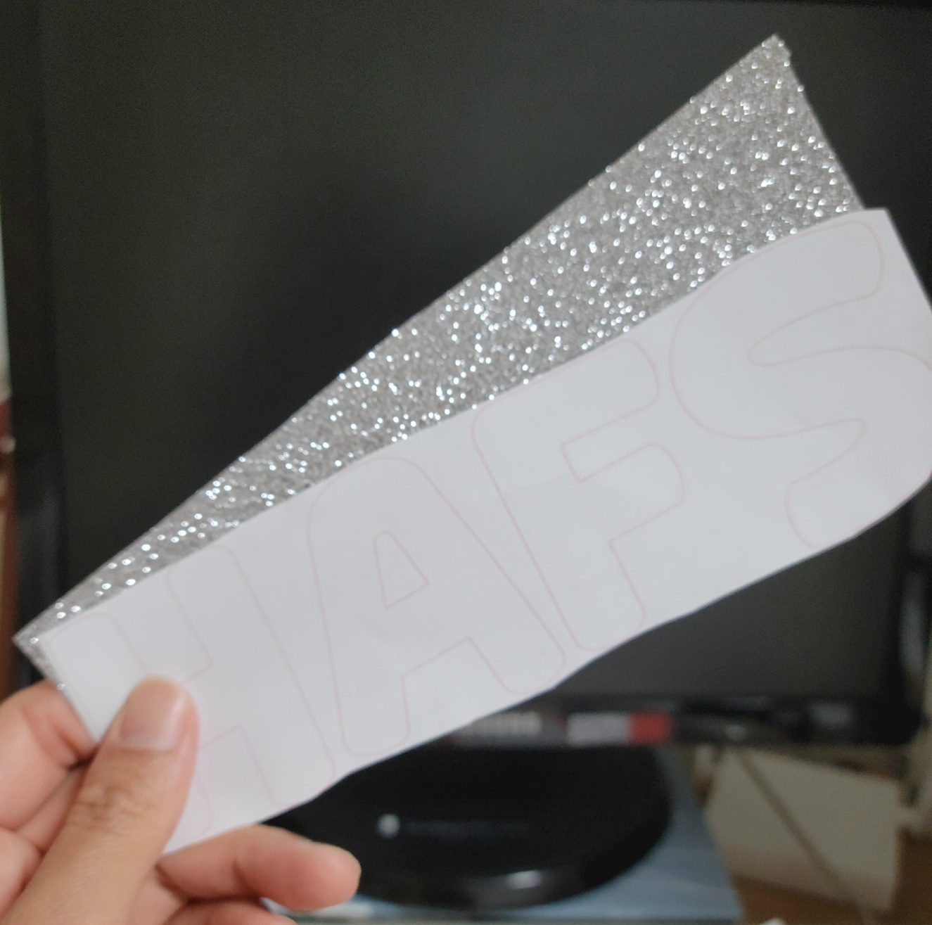 적당한 크기로 오려 글리터지 위에 스테이플러를 이용해 고정해 글씨를 따라 오려주세요.