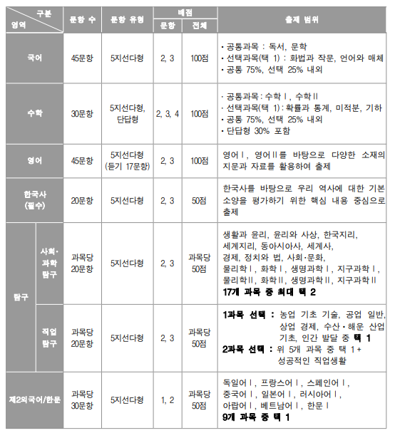 • 출제 범위, 문항유형 및 배점 : 국어, 수학, 영어, 한국사, 탐구(사회, 과학, 직업), 제2 외국어나 한문 영역으로 구성됨. 한국사 미응시시 성적 전체 무효처리. 국어영역의 경우 독서와 문학을 기본으로 화법과 작문, 언어와 매체 중 선택할 수 있음. 수학의 경우 수 1,2를 기본으로 확률과 통계, 미적분, 기하중 선택가능. 사회, 과학탐구는 17개 과목 중 최대 2개 선택가능. 제2 외국어나 한문은 총 9개 중 1개 선택. 문항유형은 5지선다형이며 수학은 답답현 30% 포함되고 배점은 문제 중요도와 난이도등에 따라 1~4점까지 배점됨.
