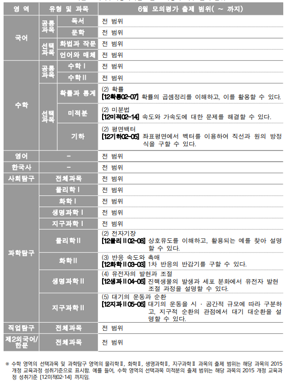 • 시험영역 : 국어, 수학, 영어, 한국사, 사회 및 과학, 직업탐구, 제2외국어 및 한문