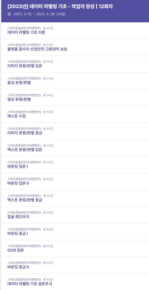 놀면 뭐 하겠습니까! 배우면 배울수록 세상에는 많은 일거리들이 풍족하게 있다는 사실이 눈에 들어오니 말입니다. 이번에는 데이터 라벨링 과정을 소개하고자 합니다. 제가 이용한 것은 우선 최소한의 비용으로 최대의 효과를 누리고자 고용노동부 HRD-Net에서 국민내일 배움 카드를 신청한 후 크라우드웍스와 고용노동부의 훈련과정을 듣기 시작한 것입니다. 신청하는 방법은 아래쪽에 링크해 두겠습니다. 데이터 라벨링 기초과정은 회차당 1000명의 수강생을 기반으로 하고 있으며 14일 동안 수강인 가능한 과정으로 관심이 있다면 마감되었더라도 과정을 검색한 아래 단락에서 다음회차확인 후 신청할 수 있으니 참고하시길 바랍니다. 총 12 회자로 구성된 데이터 라벨링 기초과정에서는 데이터 라벨링 기초이론을 시작으로 플랫폼 종사자 산업안전, 근로권익 보호에 대한 이론수업 후 본격적인 실습 훈련이 이어집니다. 이미지 분류 및 판별작업 입문, 음성분류 및 판별, 영상분류 및 판별, 텍스트 수집하는 것과 이미지 분류 및 판별과정을 거친 후 텍스트를 분류하고 판별하는 입문과정을 끝내면 바운딩 입문과정을 지나면 텍스트 분류 중급과정으로 진입하게 되고 얼굴랜드마크 및 바운딩 중급, ocr입문과정을 거쳐 바운딩 중급 2단계로 과정을 마무리하며 기초설문조사로 12회 차 진행이 됩니다. 각 과정별 참여업체의 대표 또는 부대표님들이 자신들이 추구하는 업체의 AI 기술들에 대한 설명을 진행하며 필요한 데이터 라벨링 과정에 대한 설명이 상세히 이루어져 있습니다. 시작하는데 어려움 없이 차분히 밟아가는 과정을 거치면 데이터 라벨러로써의 입지를 다져가는 과정일 것입니다.