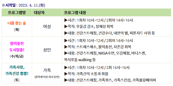 이외에도 많은 프로그램들이 운영되니 관심 있는 곳에 직접 예약하여 건강하고 행복한 시간 되시길 바라봅니다.