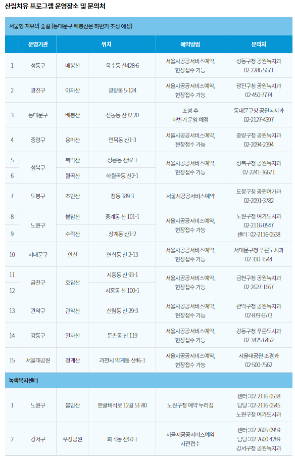 - 산림치유운영하는 곳 : 서울형 치유의 숲길, 녹색복지센터