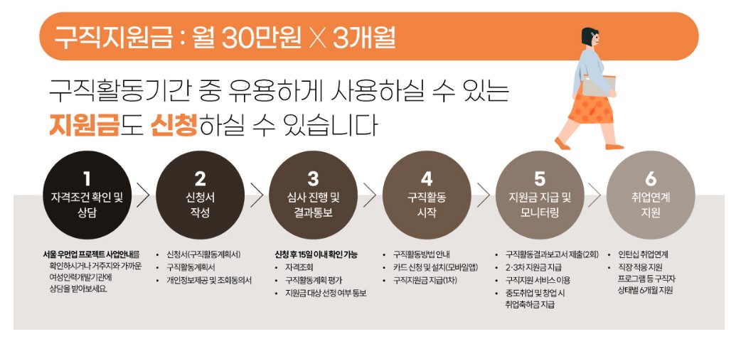 구직 기간에 유용하게 사용할 수 있도록 월 30만 원씩 3개월간(총 90만 원)을 지원합니다. 이 기간 동안 27개 서울시 여성인력개발원을 통해 취업 연계가 가능한 여성 미래직업 직업훈련 과정을 무료로 수강할 수 있습니다.