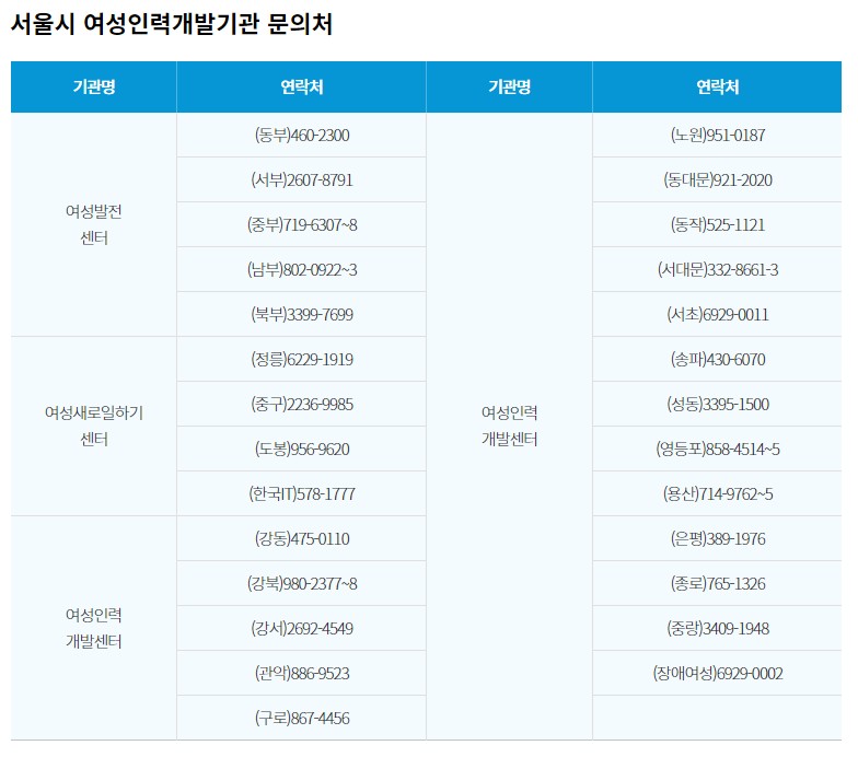 위 사업들은 서울우먼업 누리집이나 아래 연락처로 문의하면 된다고 합니다. 경력단절로 자존감이 떨어져 있을 수도 있는 지금 스스로의 가치를 증명할 수 있도록 많이들 지원하여 꿈을 펼치시길 바라봅니다.
