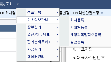 - 금융기관탭 : 코드, 거래처명, 계좌번호, 유형(보통, 당좌, 정기예금등), 해당금융기관 계좌번호