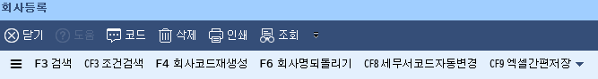 - 회사코드, 회사명, 법인 또는 개인 선택, 사용 또는 미사용(폐업등 특별한 경우가 아니면 사용)