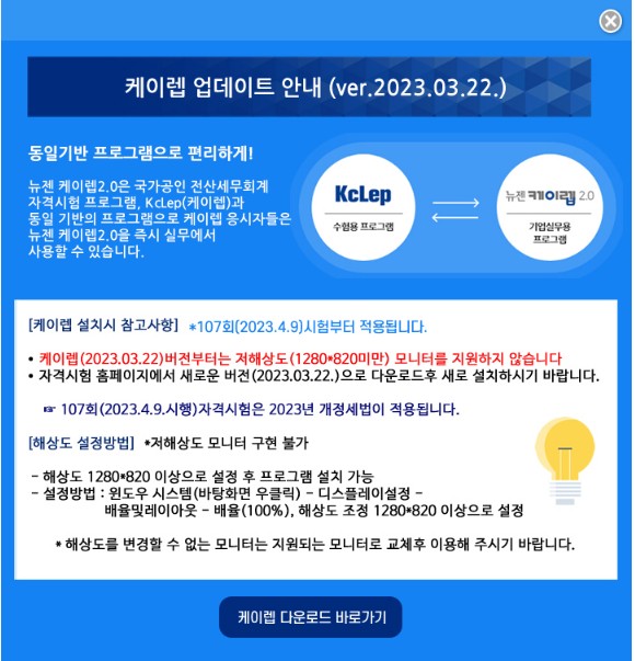 기초 정보의 등록 및 수정의 경우 우선 한국세무사회 자격시험 홈페이지(license.kacpta.or.kr)에 접속하여 케이렙 다운로드를 클릭하여 다운로드해야 합니다. 2023년 4월 9일부터 적용되는 버전의 케이렙으로 받으세요.